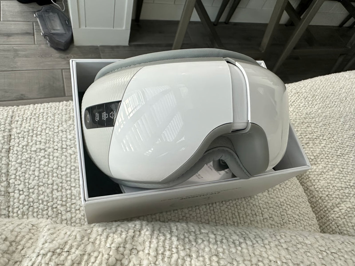 I bought this device for my long business trips, and it's been a lifesaver. It's lightweight, foldable, and the battery lasts surprisingly long. I love that I can connect it to my phone via Bluetooth and listen to calming sounds while it massages my eyes. Worth every cent!